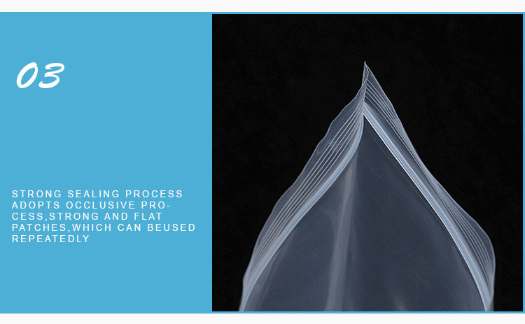 Merkmale: Wiederverschließbare Druckverschlussbeutel sind wiederverschließbar, langlebig und stabil, ungiftig, geschmacksneutral, säurefrei, verfügen über eine hervorragende wasserdichte Isolierung und können zu 100 % recycelbar und umweltfreundlich sein.