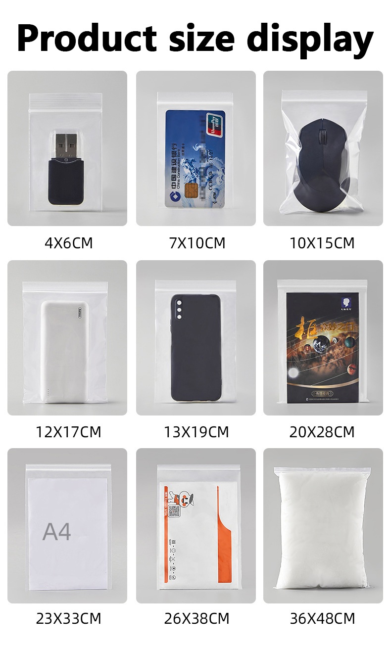 Anwendung: Wiederverschließbare Druckverschlussbeutel in verschiedenen Größen eignen sich für verschiedene Bereiche, z. B. Lagerung, Kleidung, Schuhe, Schmuck, Medizin, Hardware-Zubehör usw.